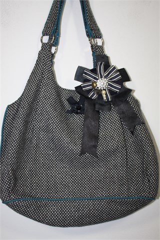 Accessorize torbica od tvida/štofa prošarano crno-bijele boje (uzorak), protkana sjajnim nitima. Zatvaranje sa magnetnim gumbom, unutra glavni pretinac i jedan bočni sa cifom. Sa vanjske strane našivene aplikacije (vidljivo na slici).