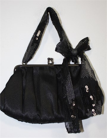 Accessorize malena torbica-novčanik (clutch) od satena crne boje. Kratka ruučkica od crnog tila, prošivena srebrnim koncem i aplicirana crnim šljokicama-ljuskicama.