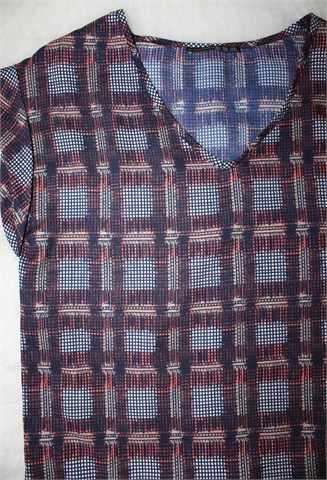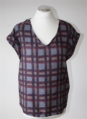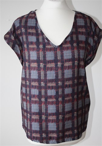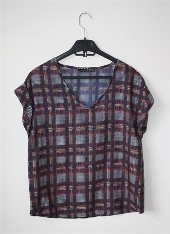 Atmosphere bluza sa kratkim rukavima, tamno plave boje sa šarenim printom (boje i uzorak printa vidljivi na slikama). Tanja i lagana, nije rastezljiva. Oversized model (vidjeti mjere).