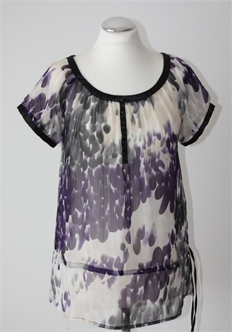Atmosphere bluza/tunika sa kratkim rukavima i šarenim uzorkom/printom (boje i uzorak kao na slikama). Prednje ukrasno kopčanje, oko ovratnika i ruba rukava saten crne boje. U struku vezica (može se po želji stegnuti), tanak i lagan materijal, providan.