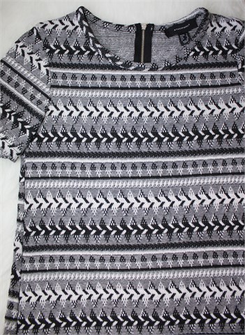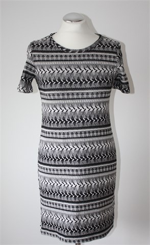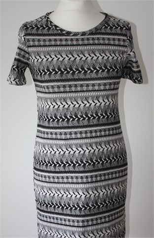 Atmosphere haljina sa kratkim rukavima, crno-bijele boje sa uzorkom (vidljivo na slikama). Mali stražnji cif. Materijal izvana djeluje kao končano pletivo, rastezljiva.