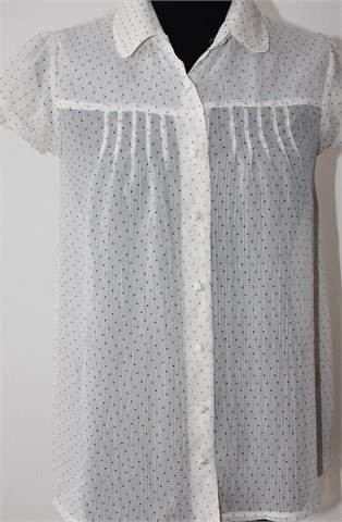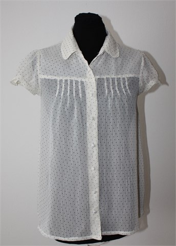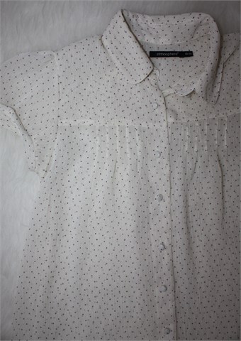 Atmosphere košulja sa kratkim rukavima, prljavo bijele boje sa printom ljubičastih točkica (vidljivo na slikama). Prednje kopčanje i ušitci, tanka i lagana. Providna i rastezljiva.