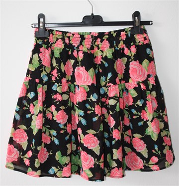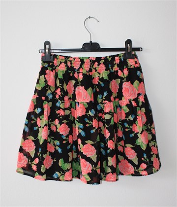 Atmosphere suknja crne boje sa šarenim cvjetnim printom (boje i uzorak printa kao na slikama). Pasica je prošivena sa gumicama pa je širina dosta prilagodljiva (vidjeti mjere). Lagana i prozračna, podstavljena.