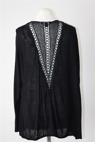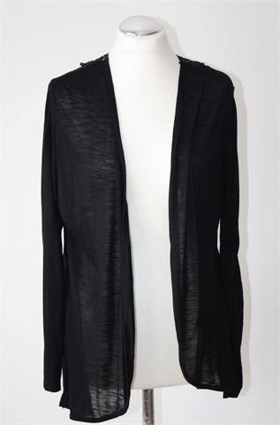 Atmosphere vesta (kardigan bez kopčanja) crne boje. Sa stražnje strane heklane aplikacije (providno). Tanak i lagan materijal, rastezljiv.