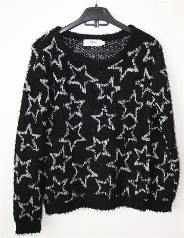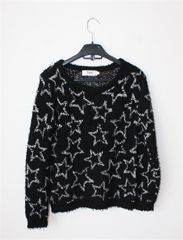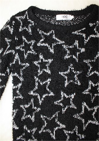 BPC (Bonprix Collection) vesta crne boje sa srebrnim zvijezdicama (blago šljokavim). Debelo, mucasto pletivo (duže niti), rastezljiva.