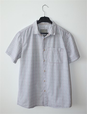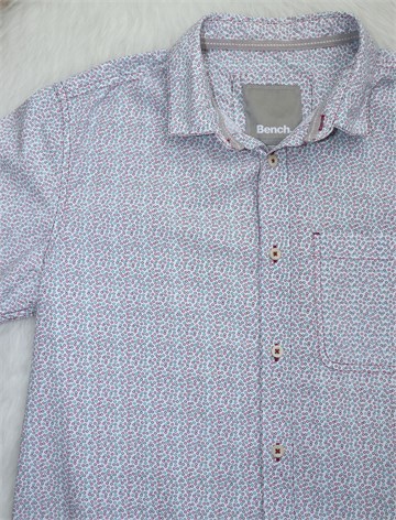 Bench košulja sa kratkim rukavima, bijele boje sa printom (boje i uzorak printa vidljivi na slikama). Prednje kopčanje, džepić na prsima. Mekan i kvalitetan pamuk, nije rastezljiv.