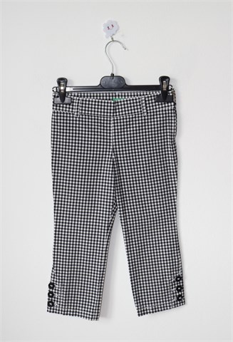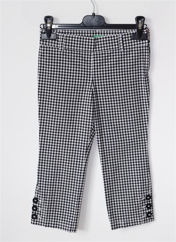 Benetton hlače crno-bijele boje (kockasti uzorak). Pasica za remen, bočni cif, unutarnja regulacije širine struka. Bočni gumbići na nogavicama, blago rastezljive.