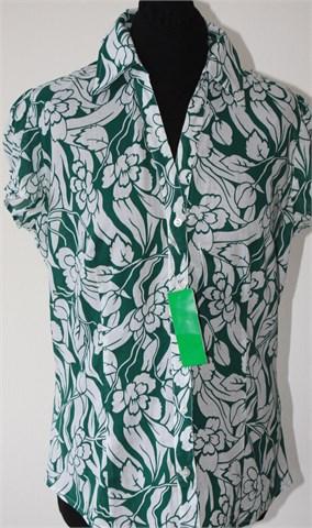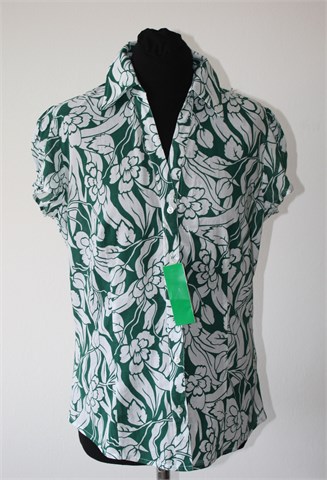 Benetton košulja sa kratkim rukavima, tamnije zelene boje sa bijelim cvjetnim uzorkom (boje i uzorak kao na slikama). Prednje kopčanje, blago strukirana. Tanja i lagana, blago providna. Nije rastezljiva.
