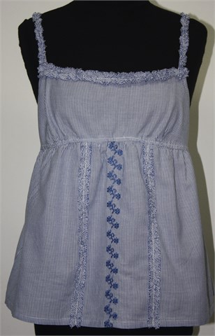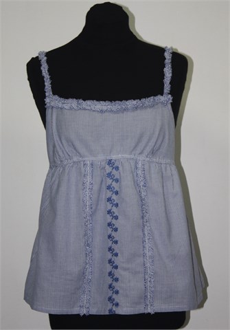 Benetton prugasti topić plavo-bijele boje, sa prednje strane aplikacije od plavog konca (vidljivo na slikama). Tanke, podesive naramenice (kao na grudnjaku), ispod prsiju i na leđima su ušivene gumice pa je širina prilagodljiva (vidjeti mjere). Tanji i lagan pamuk.