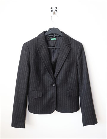 United Colour of Benetton sako tamno sive boje sa svijetlije sivim prugama. Kopčanje sa jednim gumbić sa prednje strane, prednji džepići sa preklopom. Tanki jastučići u ramenima, podstavljen.