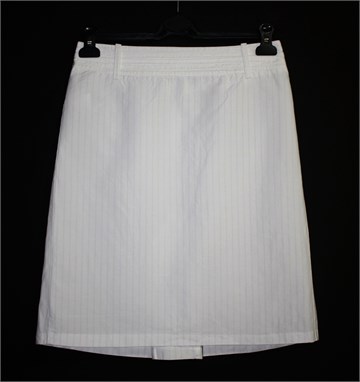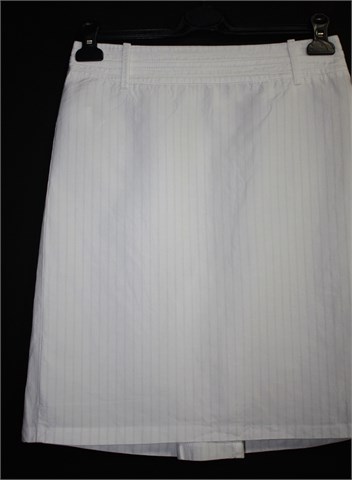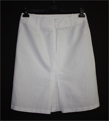Benetton suknja bijele boje sa diskretnim sivim prugama. Pasica za remen, stražnji cif i faldica umjesto proreza. Malo je duža sa stražnje strane (vidjeti mjere). Čvrst ali lagan materijal, nema podstavu.