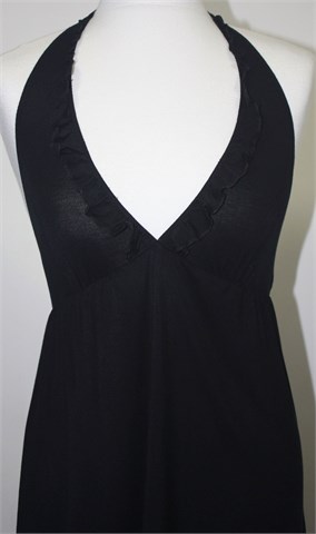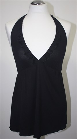Benetton topić crne boje sa vezanjem oko vrata. Volančići oko dekoltea, otvorena leđa. Gumica ispod prsiju pa je širina dosta prilagodljiva (vidjeti mjere). Tanji, mekan i rastezljiv materijal.