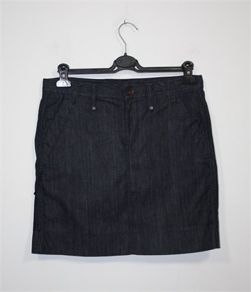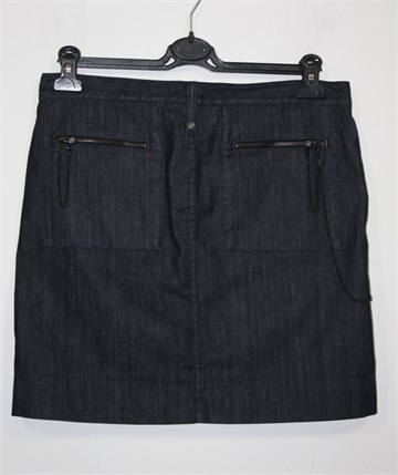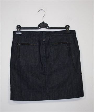 Benetton traper suknja, tamno plave boje. Prednji cif i kopčanje, pasica za remen. Prednji bočni, stražnji džepovi sa cifom (na cifovima ukrasni lančić crne boje). Rastezljiva.