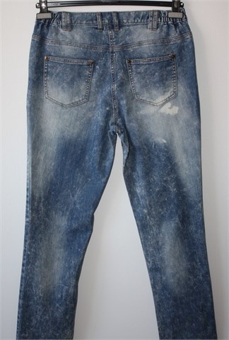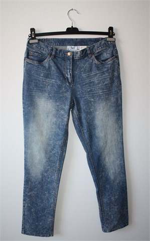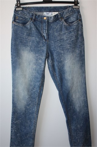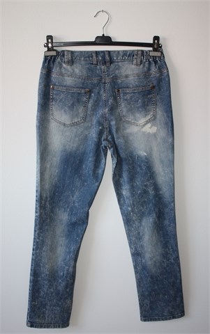Bonprix Collection (BPC) traper hlače plave boje, mjestimično izbijeđenog izgleda (vidljivo na slikama). Prednji cif i kopčanje, pasica za remen. Prednji i stražnji džepovi. Sa bočne stražnje strane pasice su gumice pa je širina prilagodljiva (vidjeti mjere). Blago rastezljive.