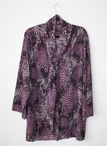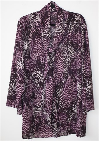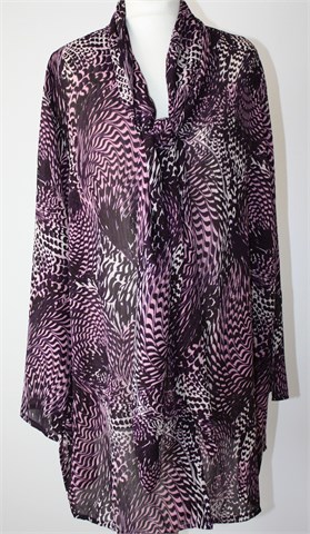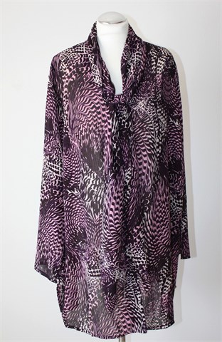 C&A duža košulja/tunika tamno ljubičaste boje sa uzorkom/printom (uzorak vidljiv na slikama - prevladavaju roza, bijela i ljubičasta boja). Prednje kopčanje, bočni prorezi. Oko ovratnika su zašivene trake koje se po želji mogu zavezati sa prednje strane (kao marama). Blago providan i malo rastezljiv materijal.