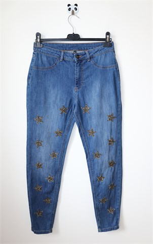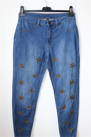 Calzedonia traper hlače, srednje plave boje, sa prednje strane aplikacije zvijezdica (vidljivo na slikama). Prednji cif i kopčanje, pasica za remen. Prednji ukrasni i stražnji klasični džepovi, blago rastezljive.