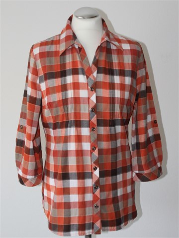 Canda (C&A) košulja sa kockasto-kariranim uzorkom (boje i uzorak vidljiv na slikama), rukavi su poludugi (mogu se nositi i kao kraći - gumbić sa vanjske strane rukava i vezica unutar rukava). Prednje kopčanje, ukrasni prošivi sa prednje strane, blago strukirana.