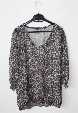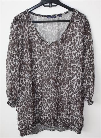 Charles Vogele bluza sa poludugim rukavima i animal printom (boje i uzorak printa vidljivi na slikama). Vezice sa prednje strane (oko ovratnika), prošivena gumicama na kraju rukava i na pasici. Tanja i lagana, providna. Nije rastezljiva.