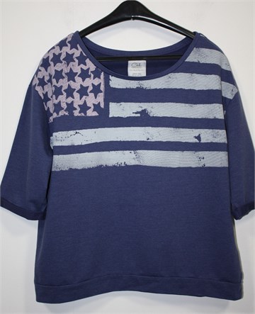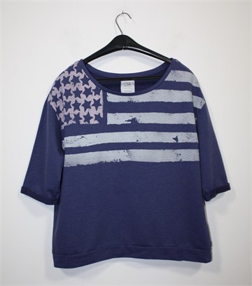 Clockhouse (C&A) majica sa kratkim/poludugim rukavima, plavo-ljubičasta sa prednjim printom (kao na slikama). Vrlo blago rastezljiva.
