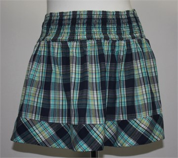 Clockhouse (C&A) kraća pamučna suknja, karirani uzorak u plavo-zelenoj kombinaciji (boje i uzorak kao na slikama). Prošivena gumicama u struku (prilagodljiva širina - vidjeti mjere), lagana i lepršava. Tanji pamuk.