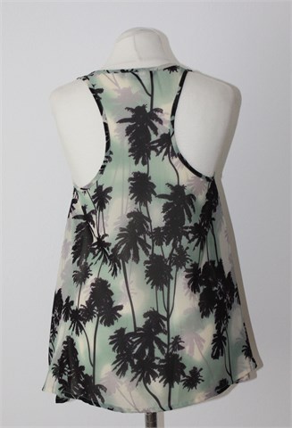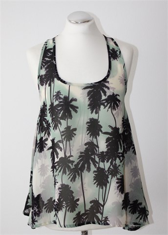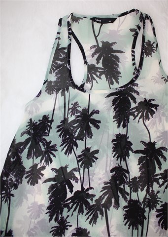 Cubus bluza bez rukava, prošarane boje sa printom palmi (boje i uzorak vidljivi na slikama). Tanja i lagana, providna. Vrlo blago rastezljiva.