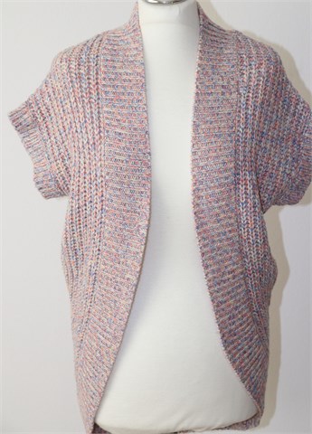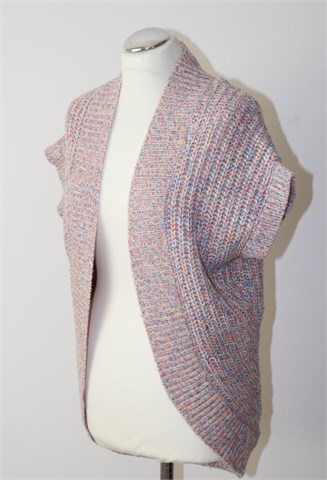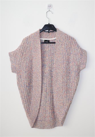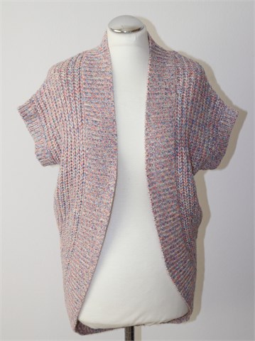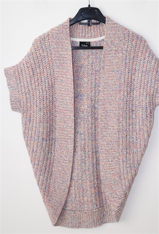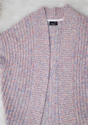 Cubus šarena vesta sa kratkim rukavima, bez kopčanja (boje vidljive na slikama). Pletivo srednje debljine, rastezljivo.