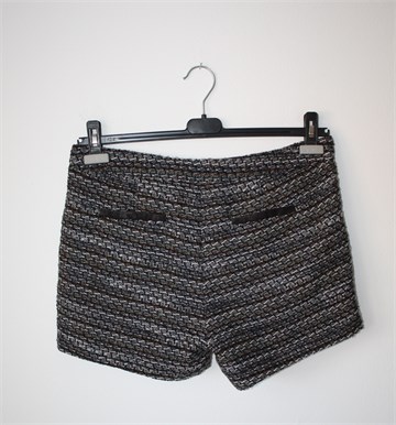 EDC by Esprit zimske kratke hlače od štofa/tvida. Prošarani prugasti uzorak (isprepletene niti), prevladavaju crna, siva, smeđa, bijela, zelena boja - mjestimično su niti šljokave (vidljivo na slikama). Prednji cif i kopčanje, cijele podstavljene. Prednji bočni, stražnji skriveni džepovi (rub džepova ukrašen crnim satenskim materijalom). Nisu rastezljive.