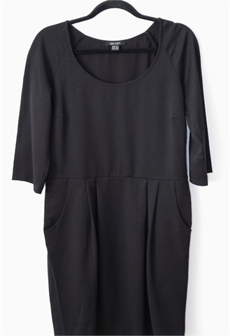 Esmara haljina sa poludugim rukavima, crne boje. Prednji bočni džepovi, cif na bočnom šavu. Plisirani materijal na leđima (vidljivo na slikama), vrlo blago rastezljiva.