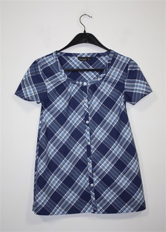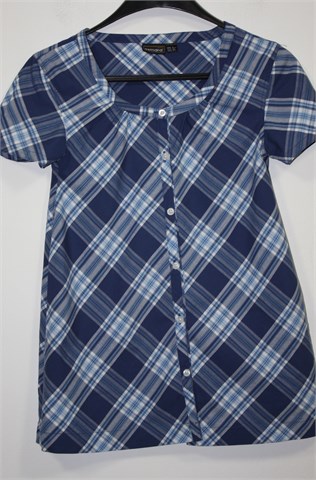Esmara košulja/bluza sa kratkim rukavima, plavo-bijele boje sa uzorkom (kao na slici). Prednje kopčanje, vrlo blago rastezljiva. Lagan pamuk.