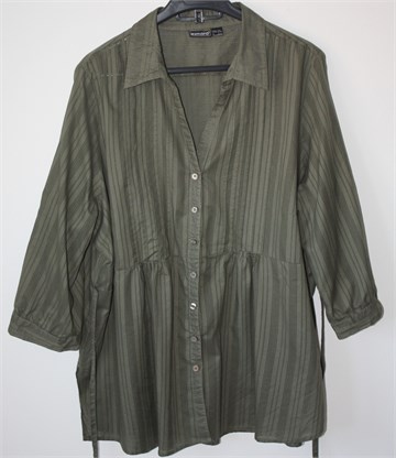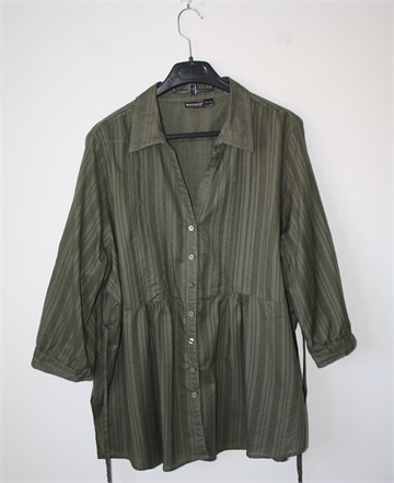 Esmara košulja/tunika sa poludugim rukavima (mogu se nositi i kao kraći, sa vanjske strane rukava je gumbić a unutar rukava je vezica), maslinaste boje sa prugastim uzorkom (vidljivo na slikama). Prednje kopčanje, bočne trake za vezanje, mali bočni prorezi. Tanja i lagana, nije rastezljiva.