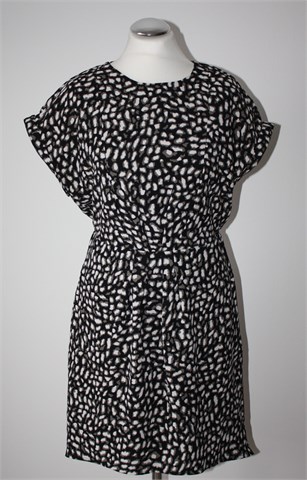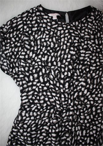 Esprit haljina sa kratkim rukavima, crne boje sa printom (boje i uzorak printa vidljivi na slikama). Prošivi na sredini haljine, sa stražnje strane u struku ušivena gumica (prilagodljiva širina). Bočni džepovi, podstavljena. Duža sa stražnje strane (vidjeti mjere).