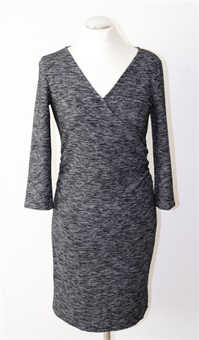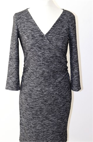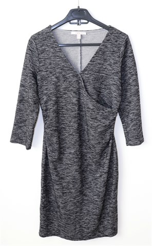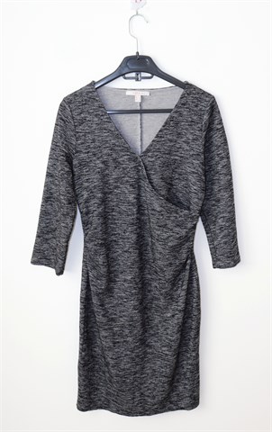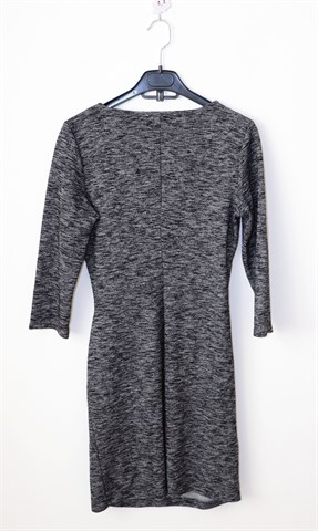 Esprit haljina sa poludugim rukavima, prošarano crno-sive boje (uzorak vidljiv na slikama). Prednji fiksni preklop, bočni nabori u struku. Rastezljiva.