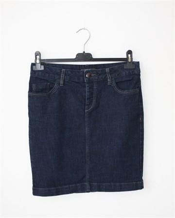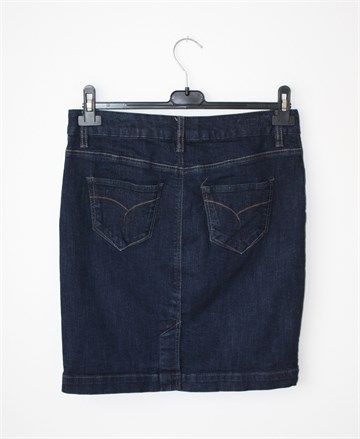 Esprit traper suknja, tamno plave boje. Prednje kopčanje, pasica za remen. Prednji bočni, stražnji klasični džepovi. Mali stražnji prorez (još uvijek tvornički zašiven), rastezljiva.