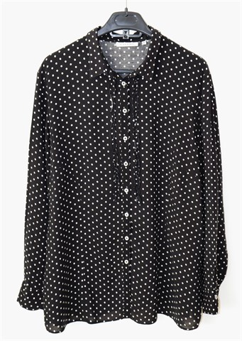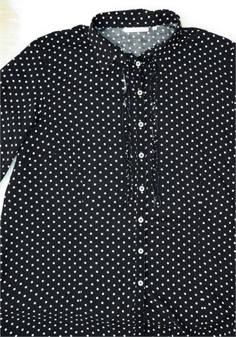 Eterna košulja sa dugim rukavima, crne boje sa bijelim točkicama. Prednje kopčanje sa gumbima (do cca pola dužine kopčanja ukrasni volančić sa svake strane), prednji ušitci. Mekan i lagan materijal, nije rastezljiv.
