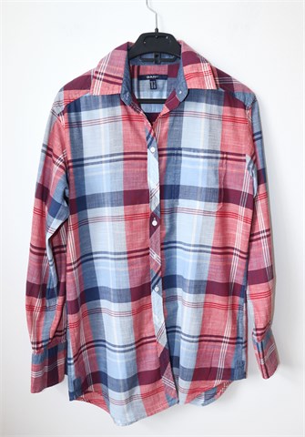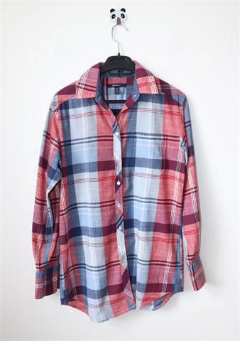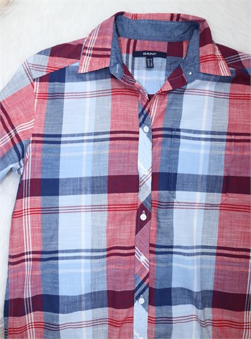 Gant košulja sa dugim rukavima (mogu se nositi i kao kraći - gumbić sa vanjske strane rukava i vezica unutar rukava) karirano-prugasti uzorak (boje vidljive na slikama). Prednje kopčanje, džepić na prsima. Lagan pamuk, nije rastezljiva.