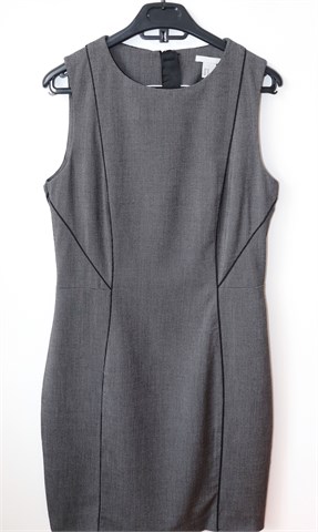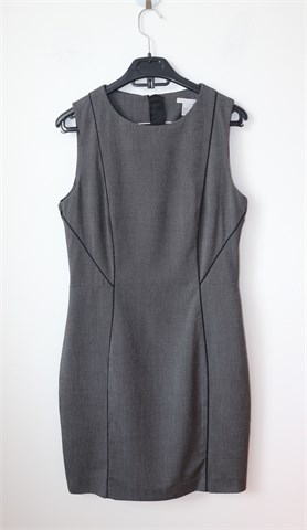 H&M haljina crno-bijele boje sa uzorkom na materijalu, poslovnog kroja. Stražnji cif, podstavljena. Strukirana.