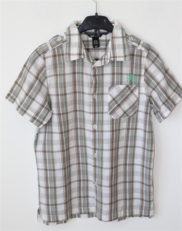 H&M Young košulja bijele boje sa prugasto-kariranim uzorkom (boje i uzorak vidljivi na slikama). Prednje kopčanje, džepić na prsima. Mali bočni prorezi. Tanji i mekan pamuk.
