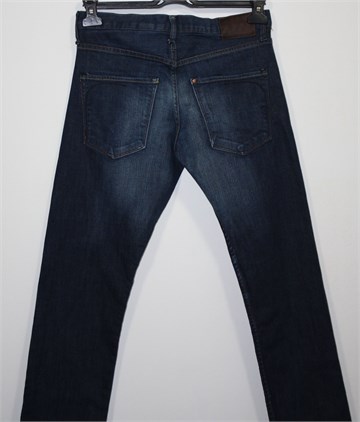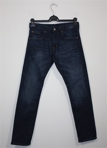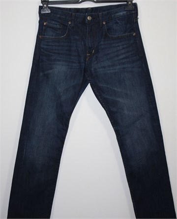 H&M traper hlače, tamno plave boje mjestimično isprano izgleda (tvornički). Prednji cif i kopčanje, pasica za remen. Prednji i stražnji klasični džepovi. Blago rastezljive.