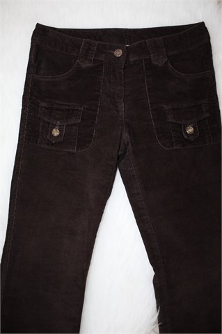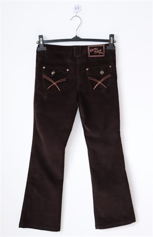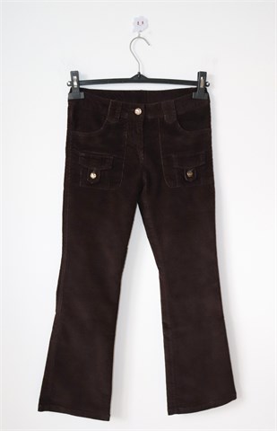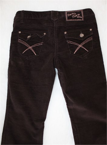 Here+There (C&A) hlače od samta, tamno smeđe boje. Prednji cif i kopčanje, pasica za remen. Prednji i stražnji džepovi (stražnji ukrašeni prošivima od konca). Svi gumbi su ukrasni (sa šljokicama i zvijezdicama). Mekane i malo rastezljive.