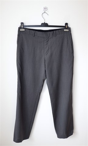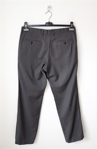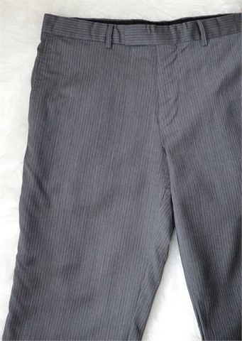 Hugo Boss hlače klasičnog kroja, sive boje sa svijetlim prugama. Prednji cif i kopčanje, uska pasica za remen. Prednji bočni, stražnji skriveni džepovi sa gumbom. Tanke i lagane. Podstavljene nogavice (samo sa prednje strane, do cca ispod koljena).