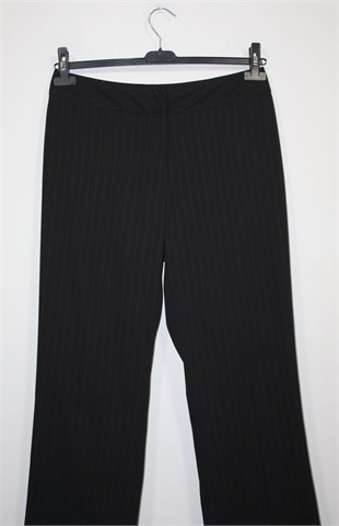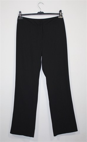 KappAhl hlače crne boje sa bež prugama, lijepog klasičnog kroja. Prednji cif i kopčanje sa kopčicama i gumbom. Lagan i mekši materijal, nije rastezljiv.