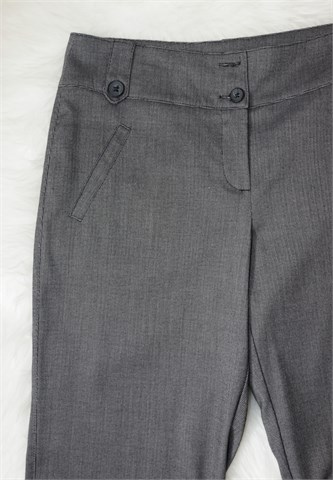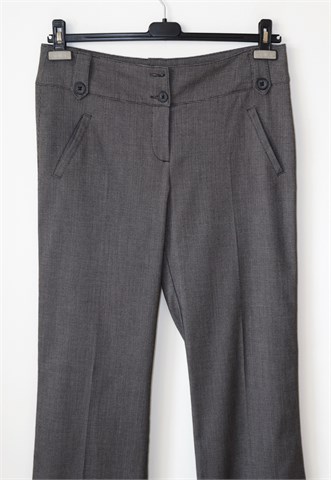 KappAhl hlače u kombinaciji crne i bijele boje (sitan uzorak na materijalu, djeluju prošarano sivo). Prednji cif i kopčanje (jedan gumb se odšio), pasica za remen. Prednji bočni, stražnji ukrasni/lažni džepovi. Blago rastezljive.