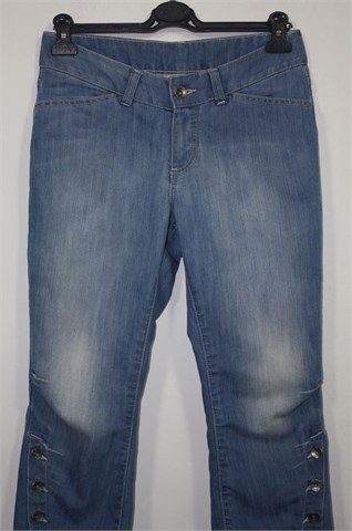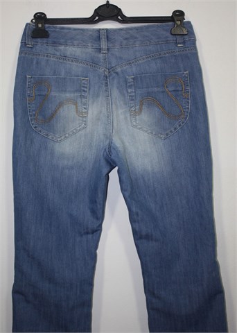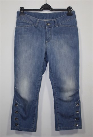 KappAhl poluduge traper hlače, svijetli traper mjestimično ispranog izgleda (tvornički used look). Prednji cif i kopčanje, pasica za remen. Prednji i stražnji klasični džepovi (stražnji ukrašeni prošivima od konca). Na dnu nogavica bočni gumbi.