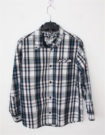 Kids by Lindex košulja sa dugim rukavima, bijele boje sa prugastim uzorkom (boje uzorka vidljive na slikama). Prednje kopčanje, džepić na prsima i kraju svakog rukava. Nije rastezljiva.