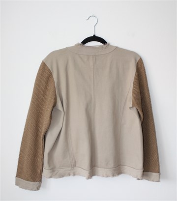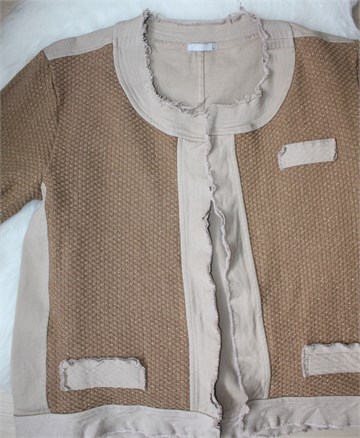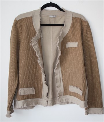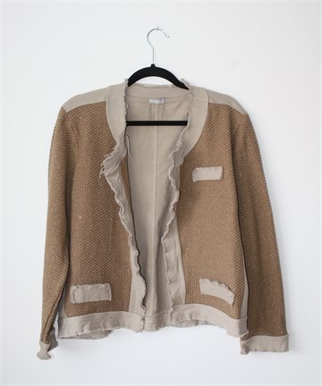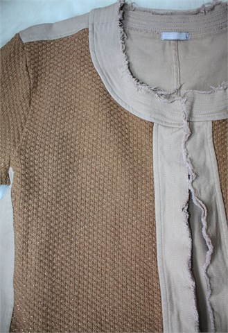 Laura Torelli jakna/blazer bež-smeđe boje (svijetlo smeđi dio jakne je pleten i u pletivu su zlaćane niti). Ocufani rubovi, imitacija džepa sa prednje strane na prsima. Srednje debljine, rastezljiva. Bez kopčanja.