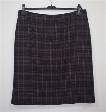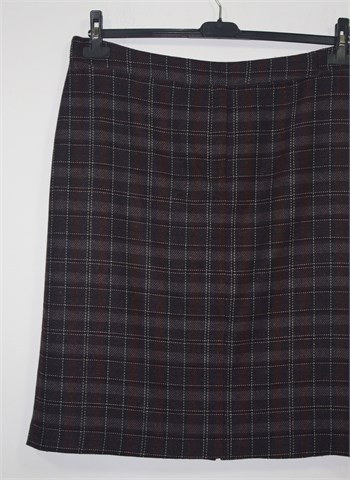 Lindex suknja od štofa, boje i uzorci kao na slici (većinom tamniji ljubičasti tonovi pomiješani sa sivom i bijelom bojom). Prednji cif i kopčanje, mali stražnji prorez. Podstavljena.