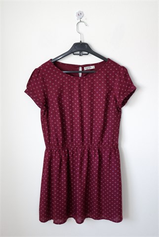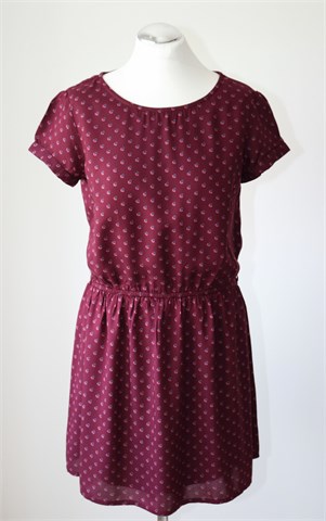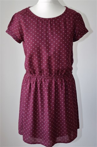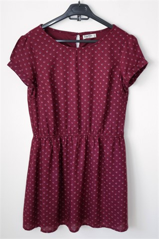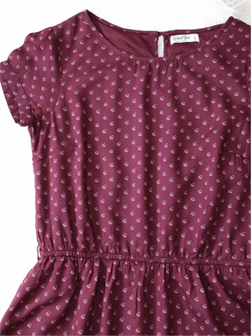 Lola & Liza haljina sa kratkim rukavima, tamno bordo crvene boje sa printom (uzorak printa vidljiv na slikama). U struku gumica i bočne ušice za remen, gumbić na vratu. Podstavljena. Mekan materijal, vrlo blago rastezljiv.