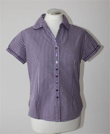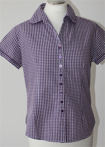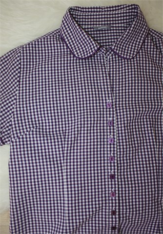Mana košulja sa kratkim rukavima, kockasti uzorak ljubičasto-bijele boje. Prednje kopčanje (jedan gumbić se odšio ali za etiketu je zašiven rezervni), gumbić na kraju svakog rukava. Mali bočni prorezi, nije rastezljiva.