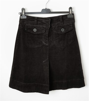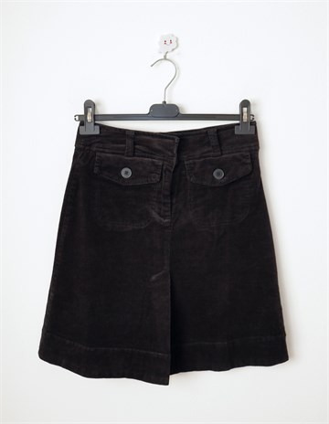 Mana suknja od tanjeg i sitnog samta, crne boje. Prednji cif i kopčanje, pasica za remen. Prednji džepovi sa preklopom i gumbom, prednja faldica. Mekana i rastezljiva.