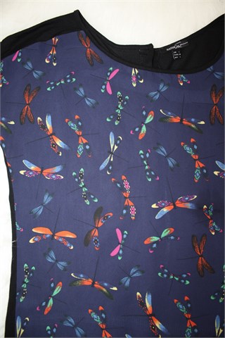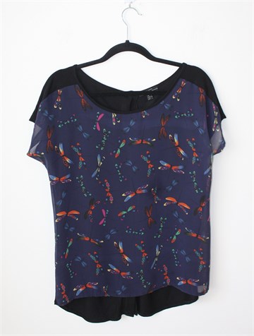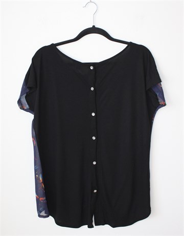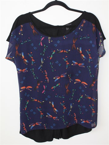 Mango Suit bluza sa kratkim rukavima. Prednja strana materijal zagasito plavo-ljubičaste boje sa printom (uzorak printa vidljivi na slikama), sa stražnje strane materijal crne boje (kopčanje sa ukrasnim gumbima po sredini). Stražnji materijal rastezljiv (oblo krojen, duži od prednje strane), prednji providan.